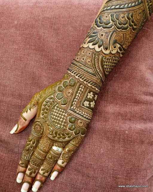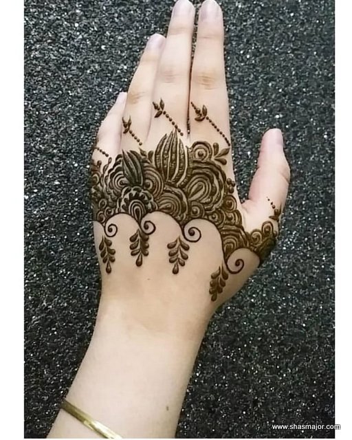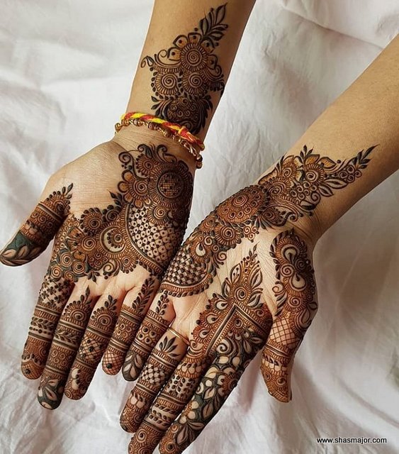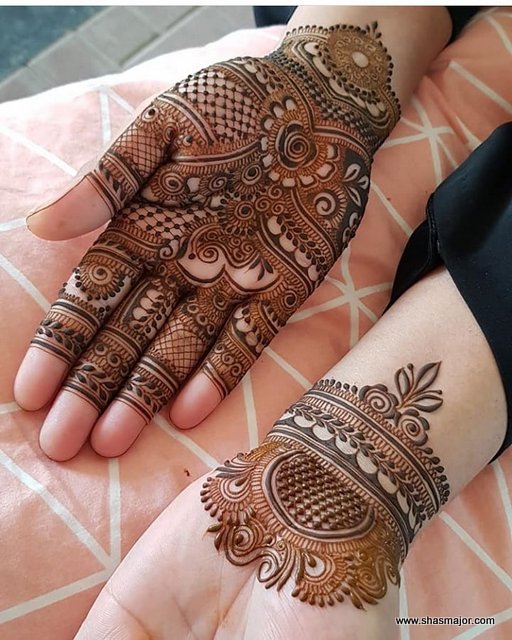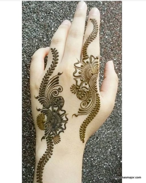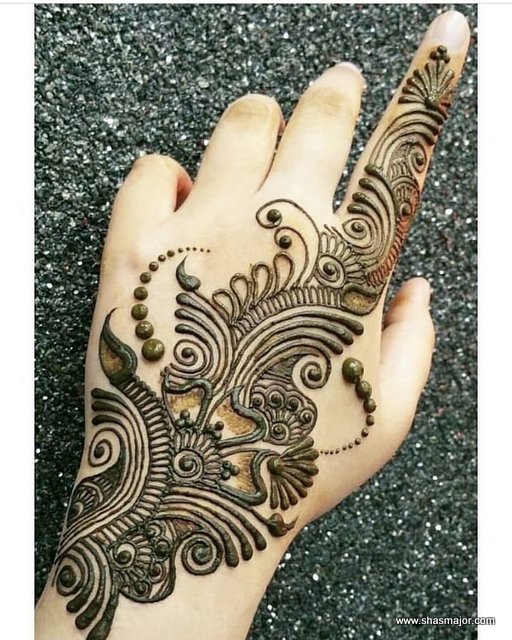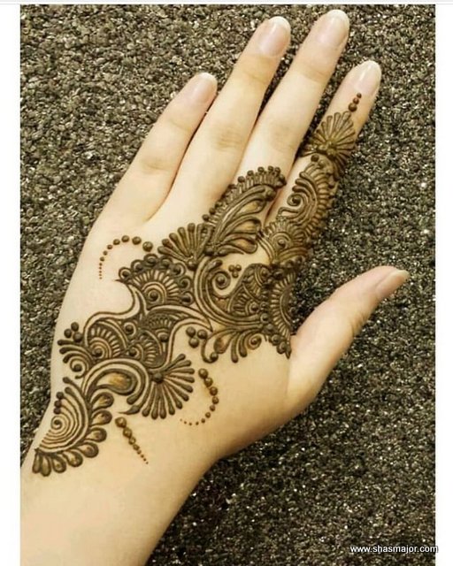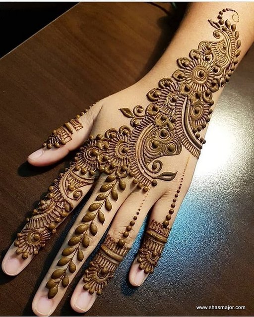 19. This designer mehndi design with fashionable and stylish a design pattern is really great mehndi design for most of the girls, as it’s not too heavy looking covering their full hand and get it has its own pattern that makes it elegant and charming in its own way with leafs pattern and dots pattern to give it a finishing, this is really suitable for teenagers and young girls to have it on any family function and occasions.