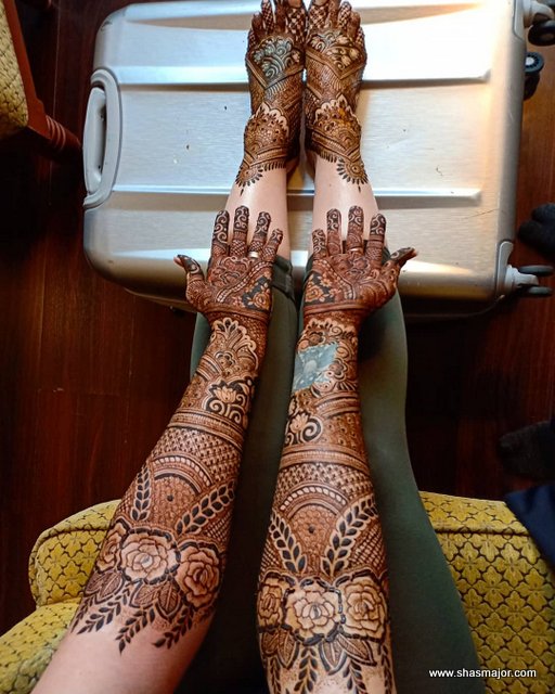 7. If you are getting married soon and cannot decide what design you should have, then check this latest mehndi design for brides with floral design mehndi covering all over your arm till the end of your forearms with a beautiful flower pattern and dark border design done by overlapping mehndi work to get the detailing of it and also covering your feet from the fingertips till the above part of your ankle making this an amazing design for any bride to have.