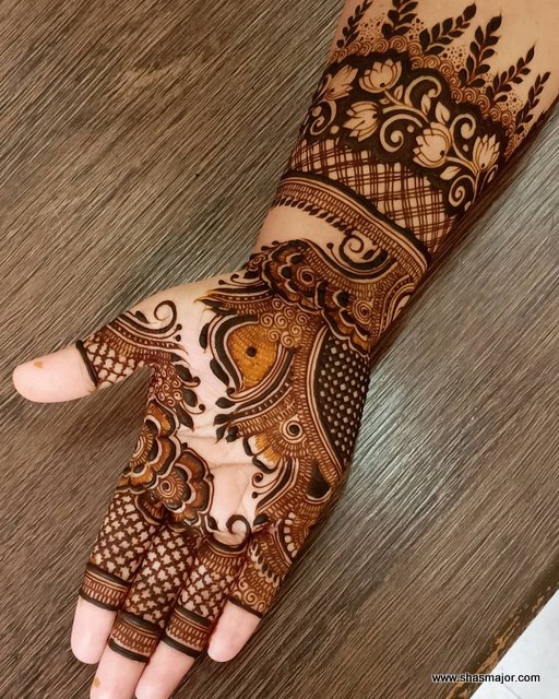 13. Designer mehndi design suitable for functions like mehndiand other occasions with the design having peacock motifs work and heart-shaped pattern design with lots of detailing makes it more attractive and a great eye catcher with this simple mehndi design covering your half forearm and your full hand it is an amazing choice to get for your family functions.