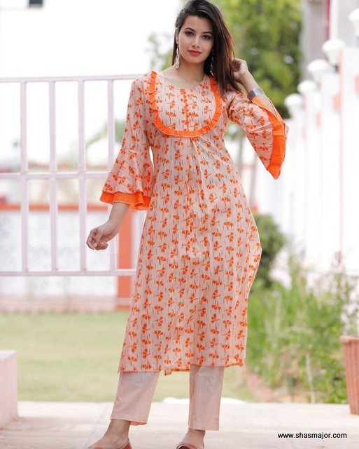 4. Going on to this another beautiful neck pattern Kurtis with latest and new neck design, in this adorable neck design you can see the overlapping pattern design with orange buttons fixed on it to get that simple yet creative approach for this neck design.