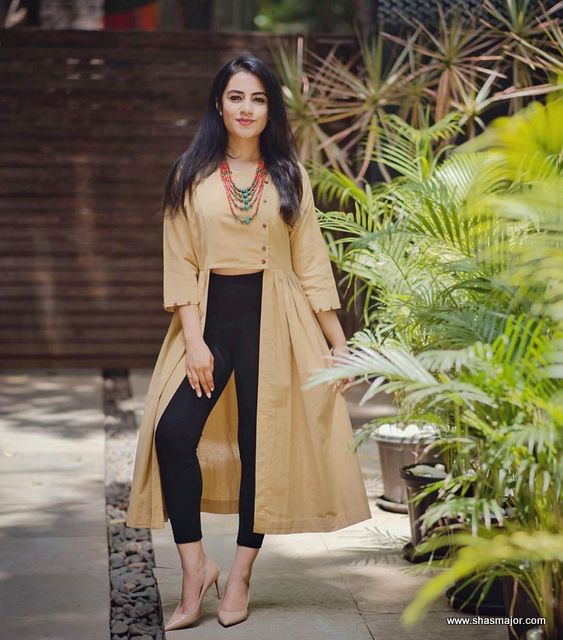 20. In many movies and TV shows you must have seen an Indo western Kurti with neckline for Kurtis, new neck design, and latest neck design, we also have a really indo-western style Kurti neck design for you with a really great indo western collar attached with zipper going down till the waist with a cut design on the back of the Kurti and really great threading design pattern on the whole Kurti making this pink Kurti more attractive and adorable.