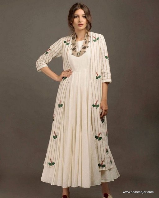 16. White lovers, this new neck design dress is the thing for you with high round neck and a waterfall pattern down the waist make this dress amazing and stylish and to make it more fashionable it is matched up with this really great outer shrug with a lining and leaf design on it. if you like fashion in your life and love to showcase it then this is the best option for you.