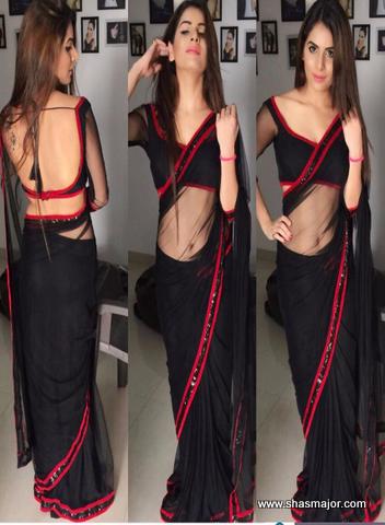 This stunning gorgeous plain black saree with a red border made of soft mono net and sequence embroidery and a bangalori silk blouse with lace. It looks pretty hot on teenagers. It is made of lightweight and machine washable material.