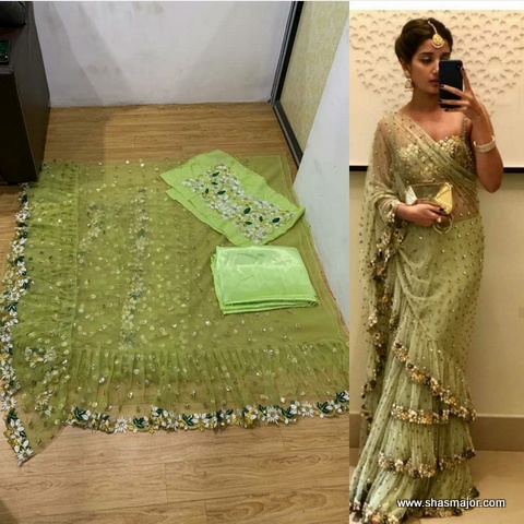 The designer parrot green soft net saree with all over chamki work and heavy work border all around and also with a self coloured ruffle border, attached to it is a silk blouse with heavy kundan work now available in the very low price with the top rated quality fabric.